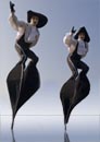 Deux échassiers aux costumes éclectiques et élégants, qui, tout en déambulant, dansent et brettent au milieu de la foule !